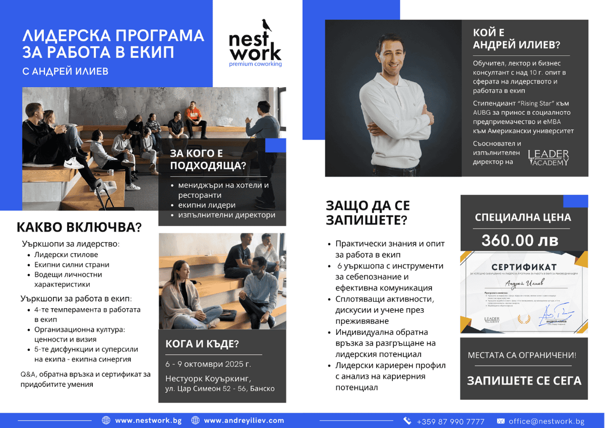 Nestwork Premium Coworking HQ Tsar Simeon 56, Bansko, Blagoevgrad, BulgariaΠΡΠΈΡΡΠ΅Π΄ΠΈΠ½Π΅ΡΠ΅ ΡΠ΅ ΠΊΡΠΌ Π½Π°Ρ Π·Π° Π΅Π΄Π½ΠΎ ΡΠ½ΠΈΠΊΠ°Π»Π½ΠΎ ΡΡΠ±ΠΈΡΠΈΠ΅, ΠΊΠΎΠ΅ΡΠΎ ΡΠ°Π·Π³Π»Π΅ΠΆΠ΄Π° ΠΏΡΠ΅Π΄ΠΈΠ·Π²ΠΈΠΊΠ°ΡΠ΅Π»ΡΡΠ²Π°ΡΠ° ΠΏΡΠΈ ΡΠ°Π±ΠΎΡΠ°ΡΠ° Π² Π΅ΠΊΠΈΠΏ Π² ΠΌΠ΅ΡΡΠ½ΠΈΡ Π±ΠΈΠ·Π½Π΅Ρ. Π©Π΅ ΠΈΠΌΠ°ΡΠ΅ Π²ΡΠ·ΠΌΠΎΠΆΠ½ΠΎΡΡ Π΄Π° ΠΈΠ·Π³ΡΠ°Π΄ΠΈΡΠ΅ Π½ΠΎΠ²ΠΈ ΠΊΠΎΠ½ΡΠ°ΠΊΡΠΈ ΠΈ Π΄Π° ΠΎΠ±ΠΌΠ΅Π½ΠΈΡΠ΅ Π΄ΠΎΠ±ΡΠΈ ΠΏΡΠ°ΠΊΡΠΈΠΊΠΈ ΠΎΡ ΡΠ°Π·Π»ΠΈΡΠ½ΠΈ ΡΠ΅ΠΊΡΠΎΡΠΈ. Π©Π΅ ΠΏΡΠ΅Π΄ΡΡΠ°Π²ΠΈΠΌ Π΅ΡΠ΅ΠΊΡΠΈΠ²Π΅Π½ ΠΈΠ½ΡΡΡΡΠΌΠ΅Π½Ρ Π·Π° ΠΌΠ΅Π½ΡΠ°Π»Π½Π° ΡΡΡΠΎΠΉΡΠΈΠ²ΠΎΡΡ, ΡΠΏΠ΅ΡΠΈΠ°Π»Π½ΠΎ ΡΠ°Π·ΡΠ°Π±ΠΎΡΠ΅Π½ Π·Π° Π»ΠΈΠ΄Π΅ΡΠΈ ΠΈ ΠΌΠ΅Π½ΠΈΠ΄ΠΆΡΡΠΈ, ΠΊΠ°ΠΊΡΠΎ ΠΈ ΠΏΠΎΠ»Π΅Π·Π½ΠΈ ΡΠ΅ΡΡΠΎΠ²Π΅ Π·Π° ΠΏΡΠΎΡΠΈΠ»ΠΈΡΠ°Π½Π΅ Π½Π° Π²Π°ΡΠΈΡ Π΅ΠΊΠΈΠΏ. […]